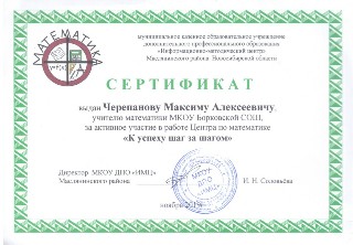 Сертификат за активное участие в работе Центра по математике "К успеху шаг за шагом" (ноябрь 2019)