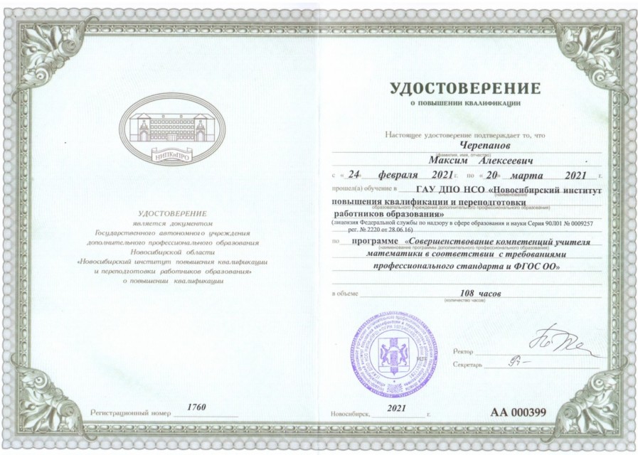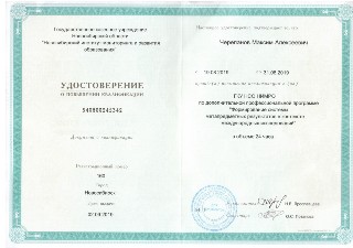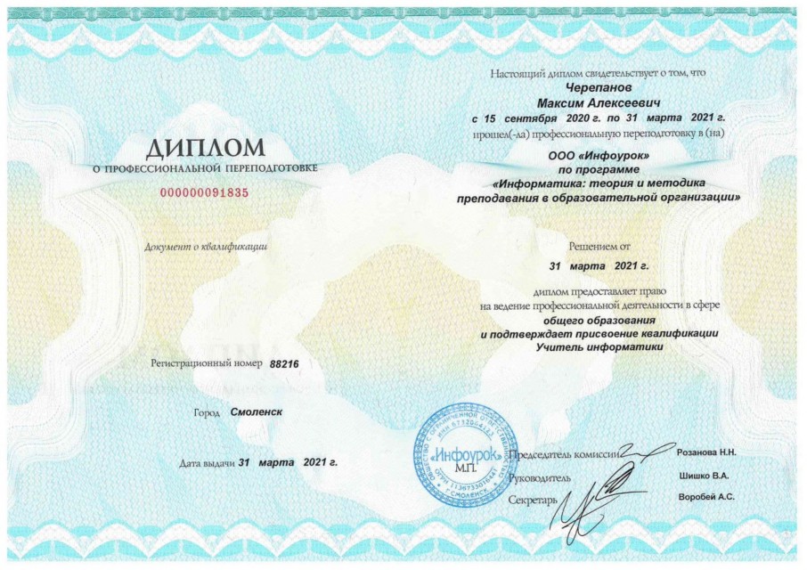 Диплом о профессиональной подготовке по программе "ОИнформатика: теория и методика преподавания в образовательной организации", квалификация "Учитель информатики"(с 15.09.2020 по 31.03.2021, 270 ч)
