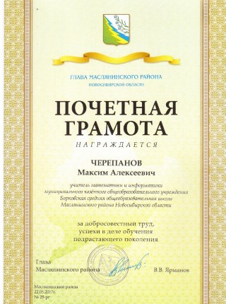 Почётная грамота Главы Маслянинского района Новосибирской области "За добросовестный труд, успехи в деле обучения подрастающего поколения" (22.03.2017)