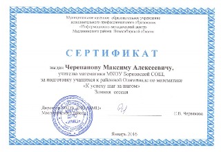 Сертификат за подготовку учащихся к районной Олимпиаде по математике "К успеху шаг за шагом" Зимняя сессия (январь 2016)