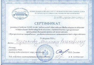 Сертификат участия в работе XVIII съезда работников образования Новосибирской области "Образование Новосибирской области: стратегические приоритеты" проблемная дискуссия учителей математики "Приоритетные направления развития школьного математического образования" (23.08.2018)