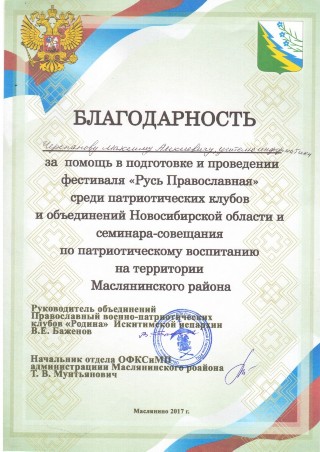 Благодарность за помощь в подготовке и проведении фестиваля "Русь Православная" среди патриотических клубов и объединений Новосибирской области и семинара-совещания по патриотическому воспитанию на территории Маслянинского района (2017)