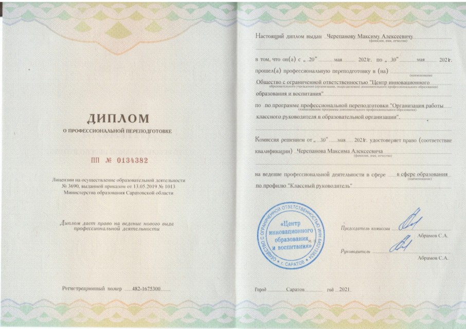 Диплом о профессиональной подготовке по программе "Организация работы классного руководителя в образовательной организации", по профилю "Классный руководитель"(с 20.05.2021 по 30.05.2021, 250 ч)