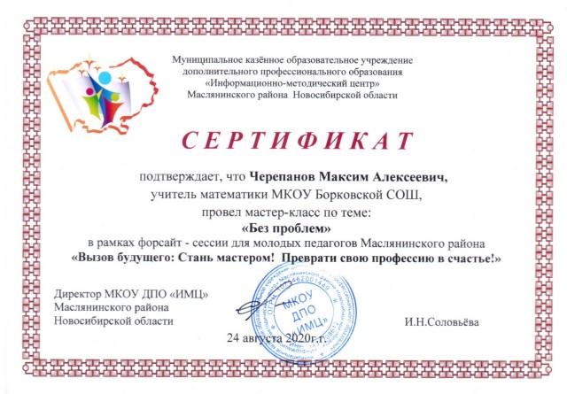 Сертификат о проведении мастер-класса в рамках форсайт-сессии для молодых педагогов Маслянинского района "Вызов будущего: Стань мастером! Преврати свою профессию в счастье!" (24 августа 2020)