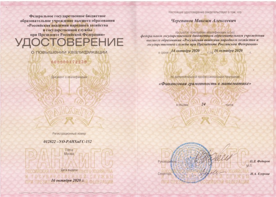 Удостоверение о повышении квалификации по теме "Финансовая грамотность в математике" (с 14.10.2020 по 16.10.2020, 24 ч)